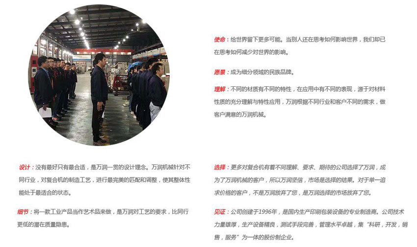 溫州萬潤機械有限公司(原瑞安市意聯(lián)機械有限公司)位于浙江省最前沿的東海之濱瑞安市。距機場,火車站30多公里,緊靠104國道,交通便利。公司創(chuàng)建于1996年,是國內生產(chǎn)印刷包裝設備的專業(yè)制造商。